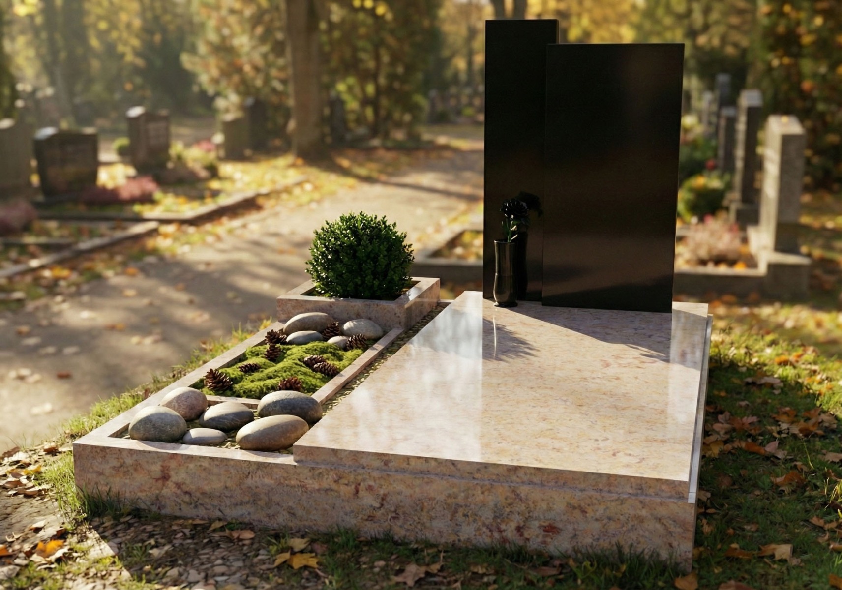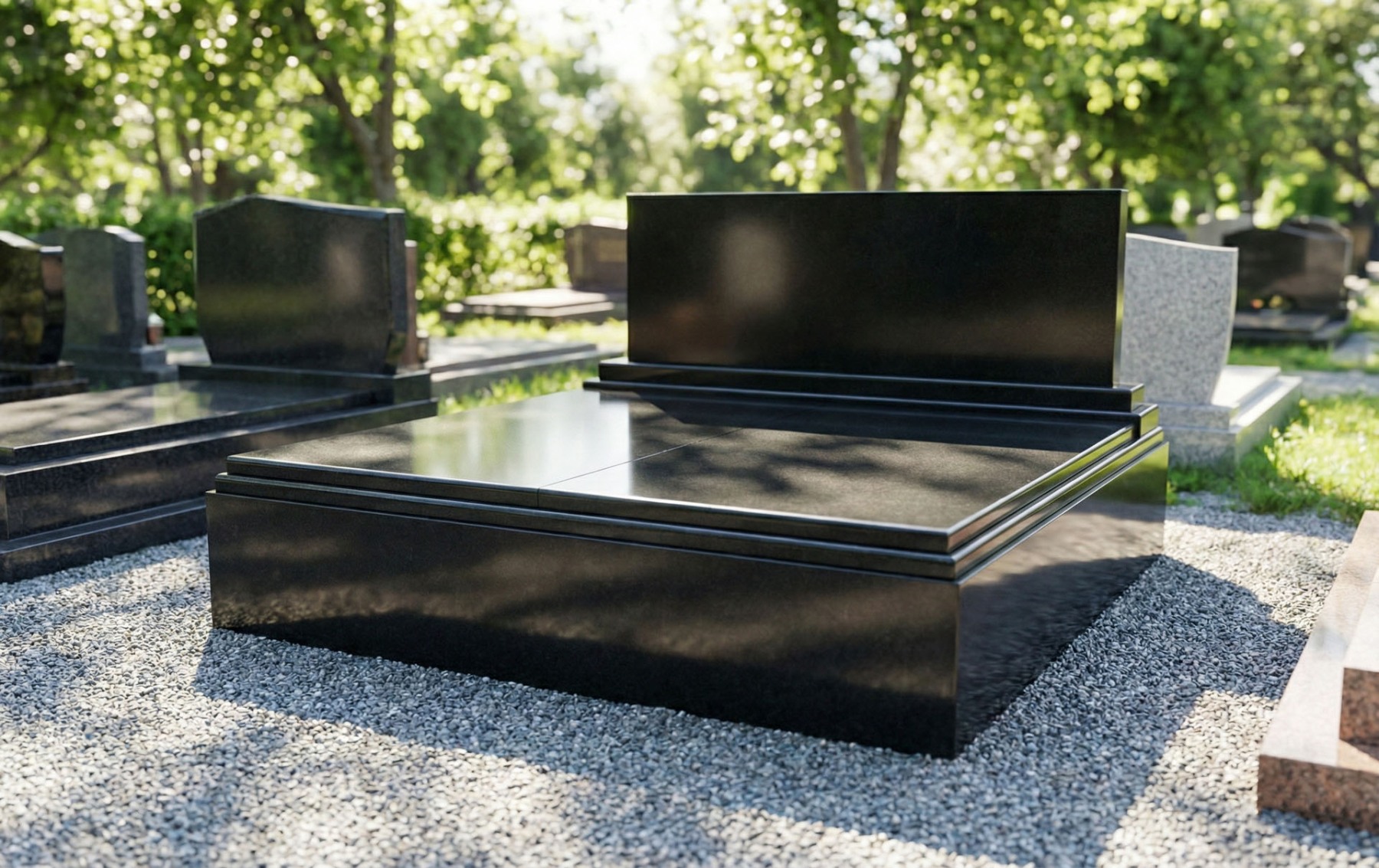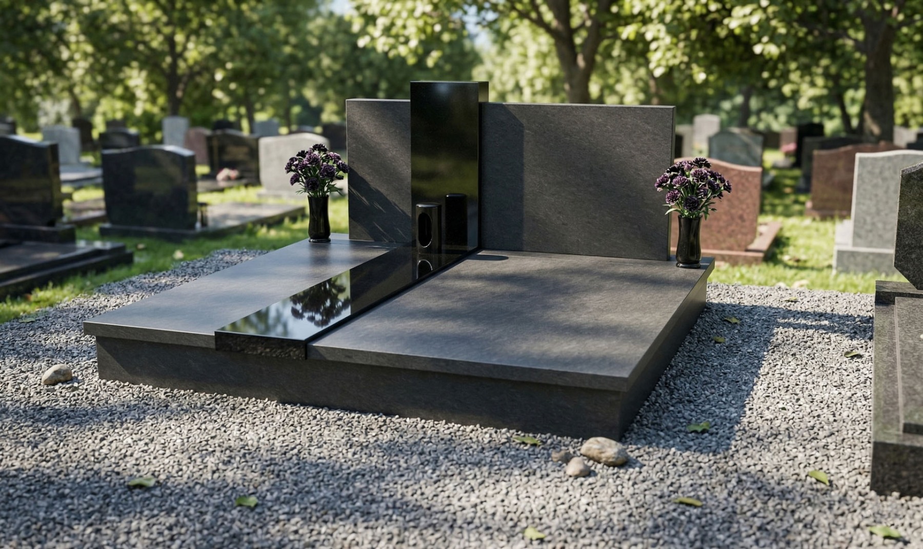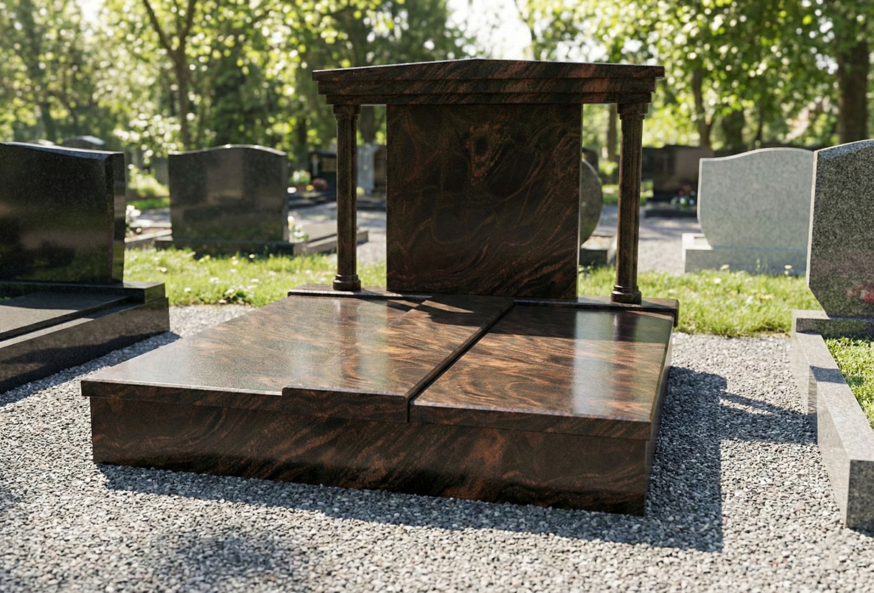 Žulový dvojhrob s pomníkom má neustály krásny lesk, ktorý je neporovnateľný so staršími hrobmi vyrobených z umelého kameňa Terraco. Ponúkame široký sortiment náhrobných kameňov, ktoré vyrábame do rôznych tvarov hrobov a pomníkov podľa predstáv zákazníkov.