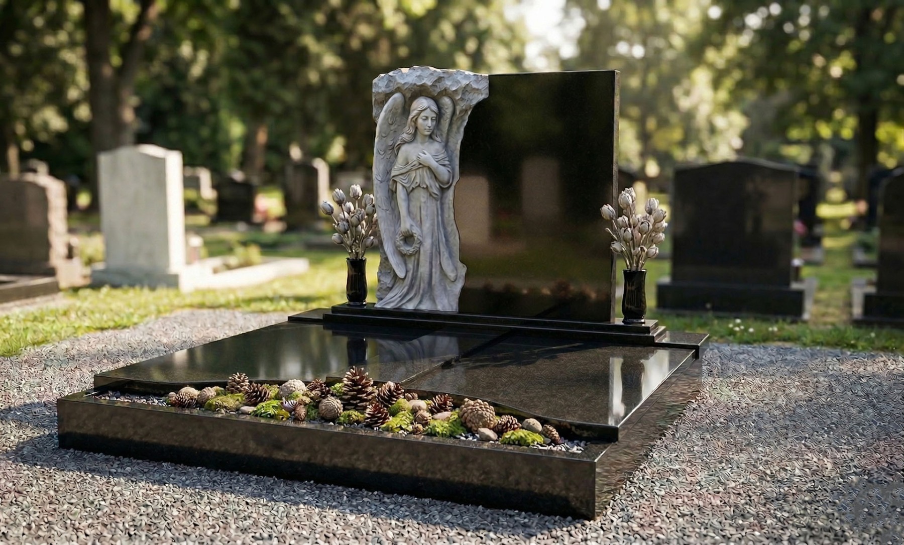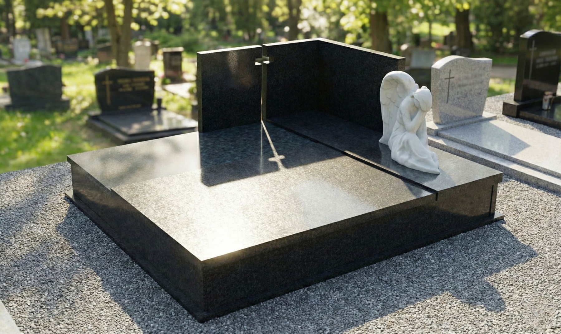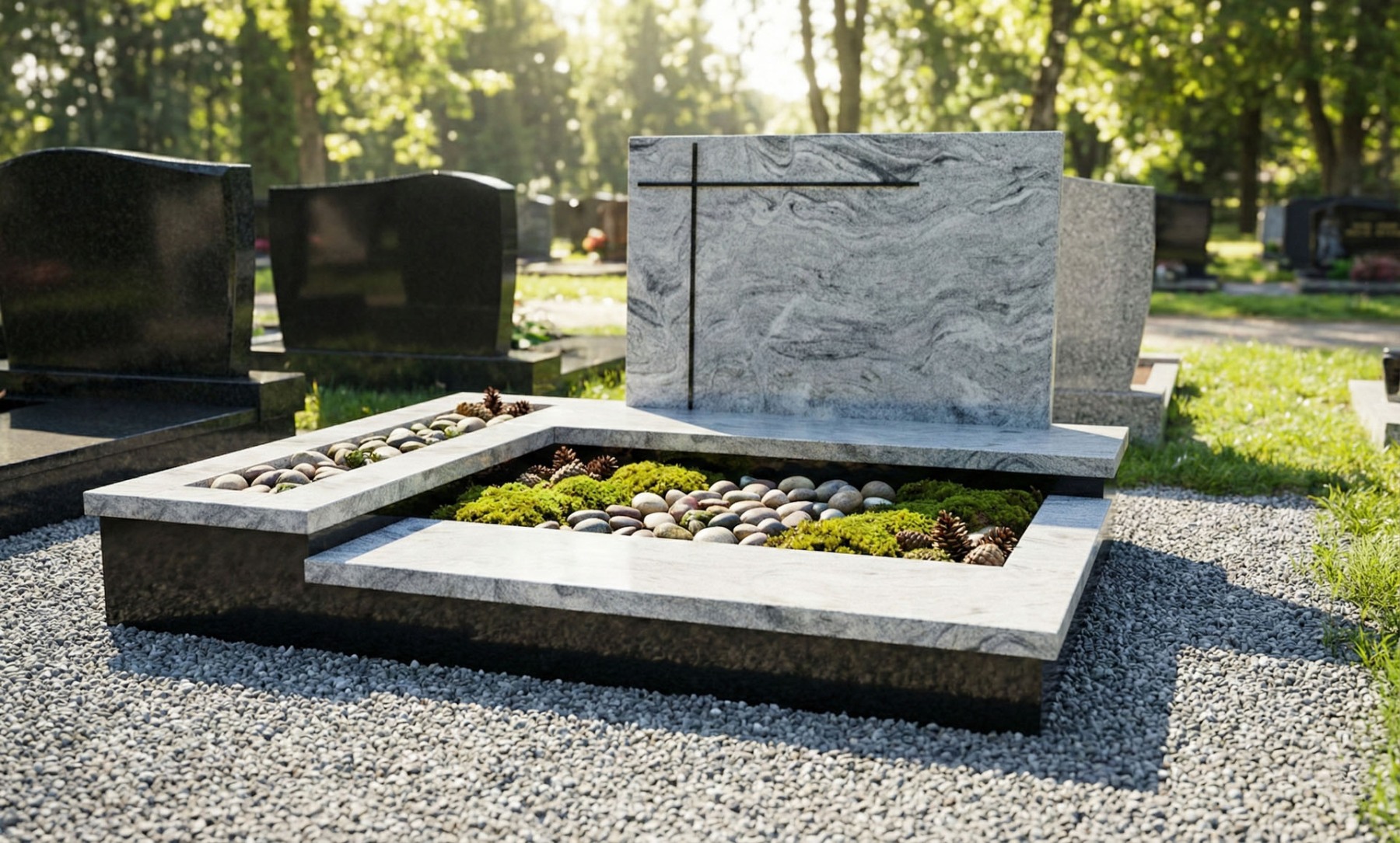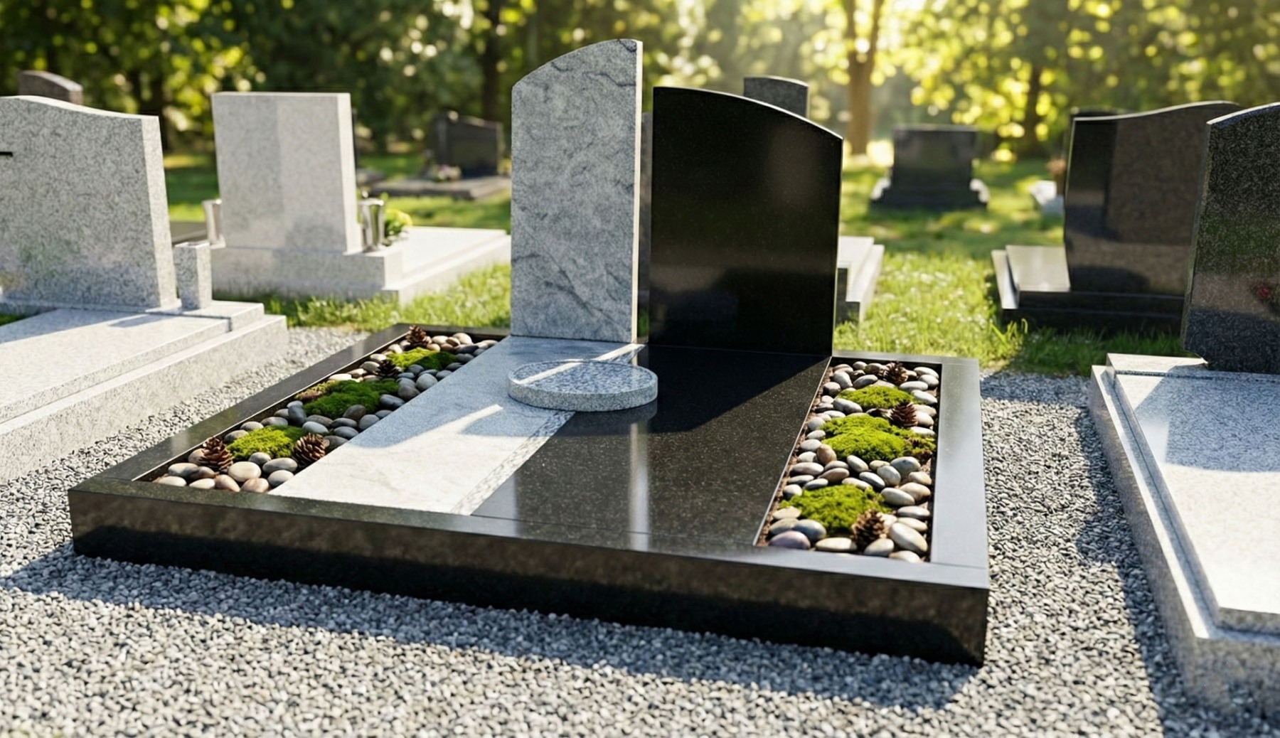Žulový dvojhrob s pomníkom má neustály krásny lesk, ktorý je neporovnateľný so staršími hrobmi vyrobených z umelého kameňa Terraco. Ponúkame široký sortiment náhrobných kameňov, ktoré vyrábame do rôznych tvarov hrobov a pomníkov podľa predstáv zákazníkov.