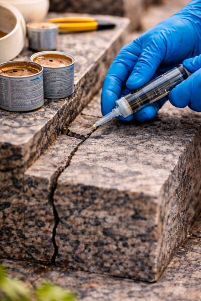 Pri starších povrchoch sa často objavujú drobné praskliny, odlupujúce sa časti alebo poškodené hrany. V takých prípadoch sa vykonáva lokálna oprava kameňa špeciálnymi tmelmi alebo doplnením chýbajúcich častí.